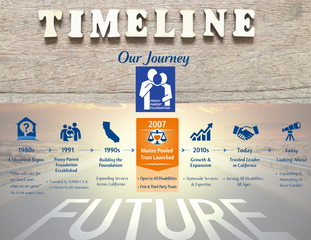 Building on its foundation as a trust protector for family-generated trusts, Proxy Parent Foundation expanded its services to meet the evolving needs of individuals and families. A major milestone came in 2007 with the creation of the PLAN of California Master Pooled Special Needs Trust, allowing the organization to serve as trustee and provide a comprehensive trust solution for both self-settled (first-party) and family-funded (third-party) trusts.